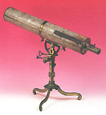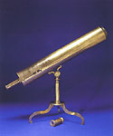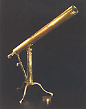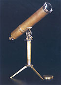 A compact 2 and 1/2 inch refracting telescope by Ramsden about 1760. The brass body tube is signed Ramsden London. Two adjustment knobs on the tapered brass mount--one for angling the tube up and down and the other for adjusting the direction of the tube right or left. Internal screw focusing for the eyepiece.